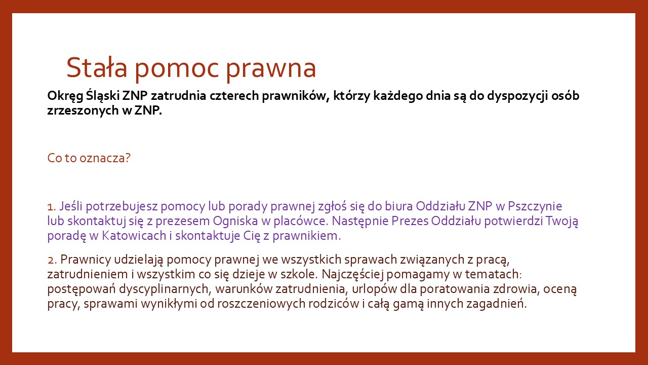 Cały czas silną działalnością Oddziału ZNP w Pszczynie jest pomoc prawna. W ubiegłym roku kalendarzowym nasz dział prawny udzielił blisko 400 porad. W tym roku to już 70 reakcji w tej materii.