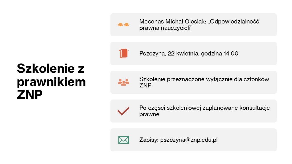 W materii prawnej jako Oddział ZNP w Pszczynie organizujemy dodatkowo szkolenia. Najbliższe szkolenie poprowadzi w Pszczynie prawnik ZNP Mecenas Michał Olesiak.